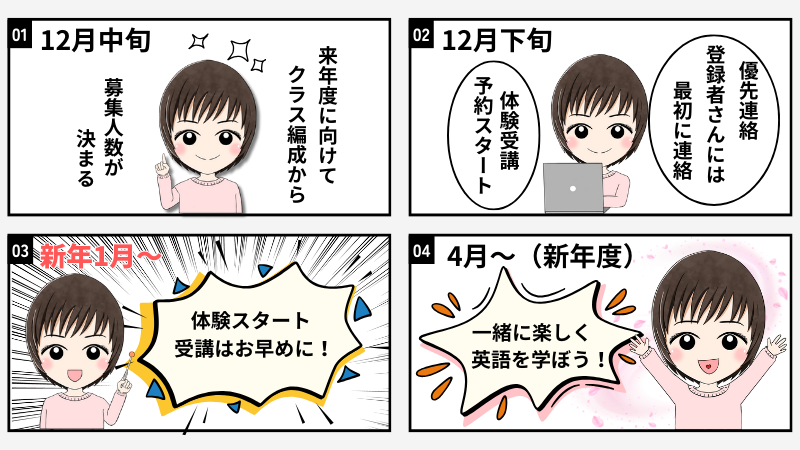 上記2026年度(4月スタート)子ども英会話 生徒募集の流れの漫画を文章でご説明すると下記のようになります。