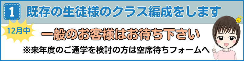 全クラスの編成が終わりませんと来年度の募集人数が決まりませんので、一般のお客様は少しお待ち下さいませ。