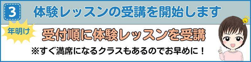 【3】予約順に体験レッスンを受講していただく(1月~席が埋まるまで)